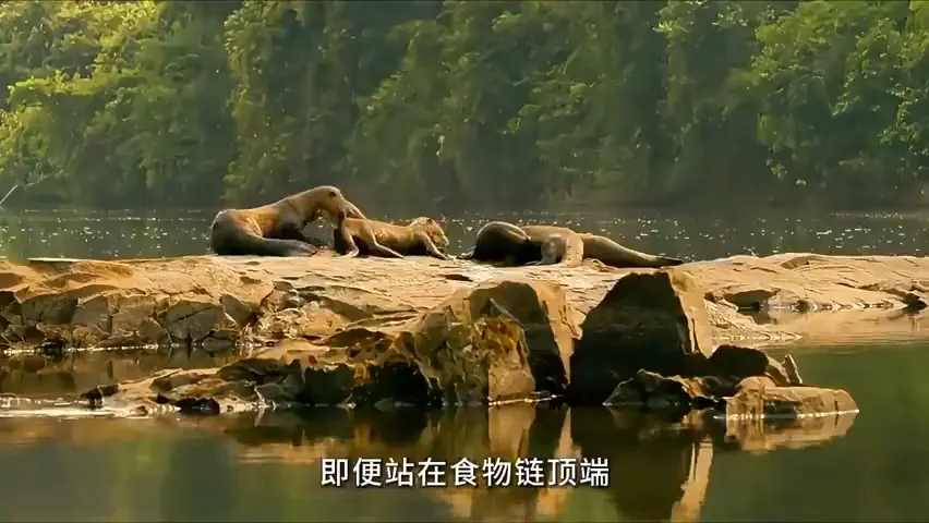巨型水獭以家族为单位生活,成年个体轮流警戒、协同捕猎,为幼崽筑起第一道防线。但即便如此,幼崽的成活率也只有一半。第一次下水的幼崽满是好奇与兴奋,它们在水中翻滚、追逐,不知不觉间离巢穴越来越远,而危险也在这一刻悄然临近。